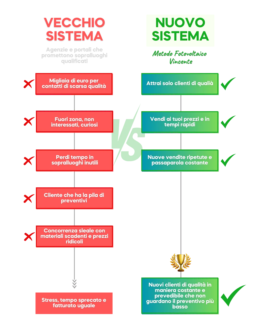 Mentre i classici metodi ti generano leads da lavorare, il Metodo Fotovoltaico Vincente ti interfaccia direttamente con il cliente che ha intenzione di installare.